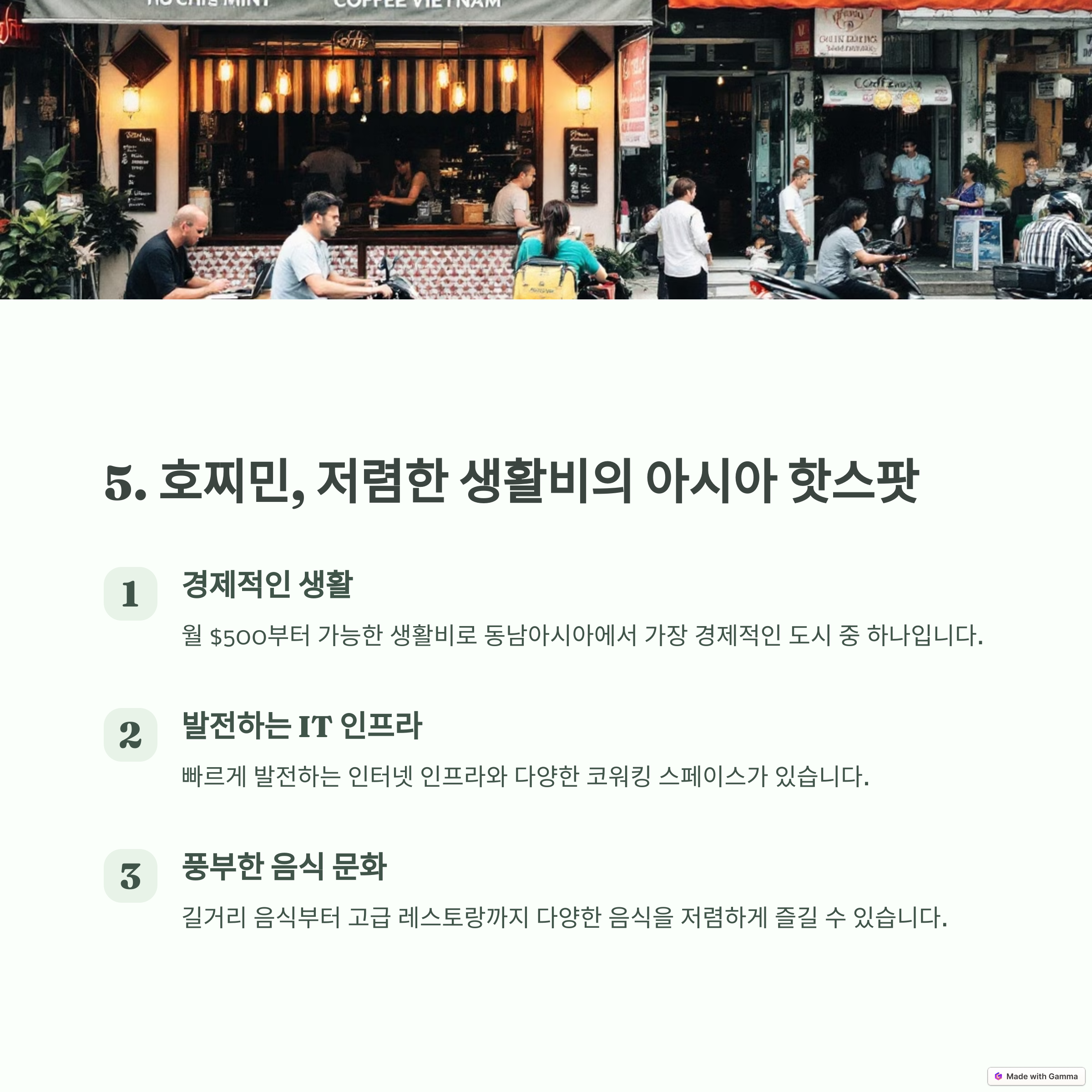 베트남의 경제 중심지인 호찌민은 디지털 노마드들에게 매력적인 도시입니다. 빠른 인터넷과 저렴한 물가, 그리고 맛있는 베트남 음식을 즐길 수 있죠. 또한, 많은 외국인들이 거주하며 국제적인 분위기를 느낄 수 있습니다.