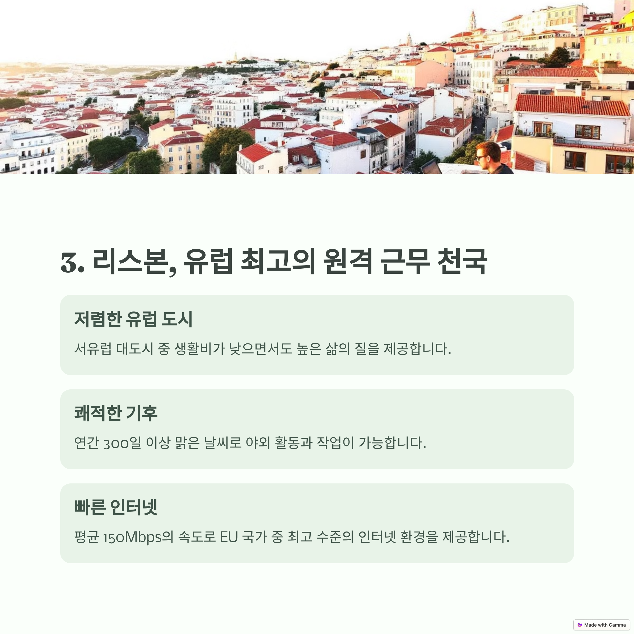유럽에서 디지털 노마드들에게 가장 인기 있는 도시 중 하나가 바로 리스본입니다. 따뜻한 기후와 아름다운 해안가, 그리고 유럽에서도 비교적 저렴한 물가 덕분에 많은 사람들이 리스본에서 원격 근무를 합니다.