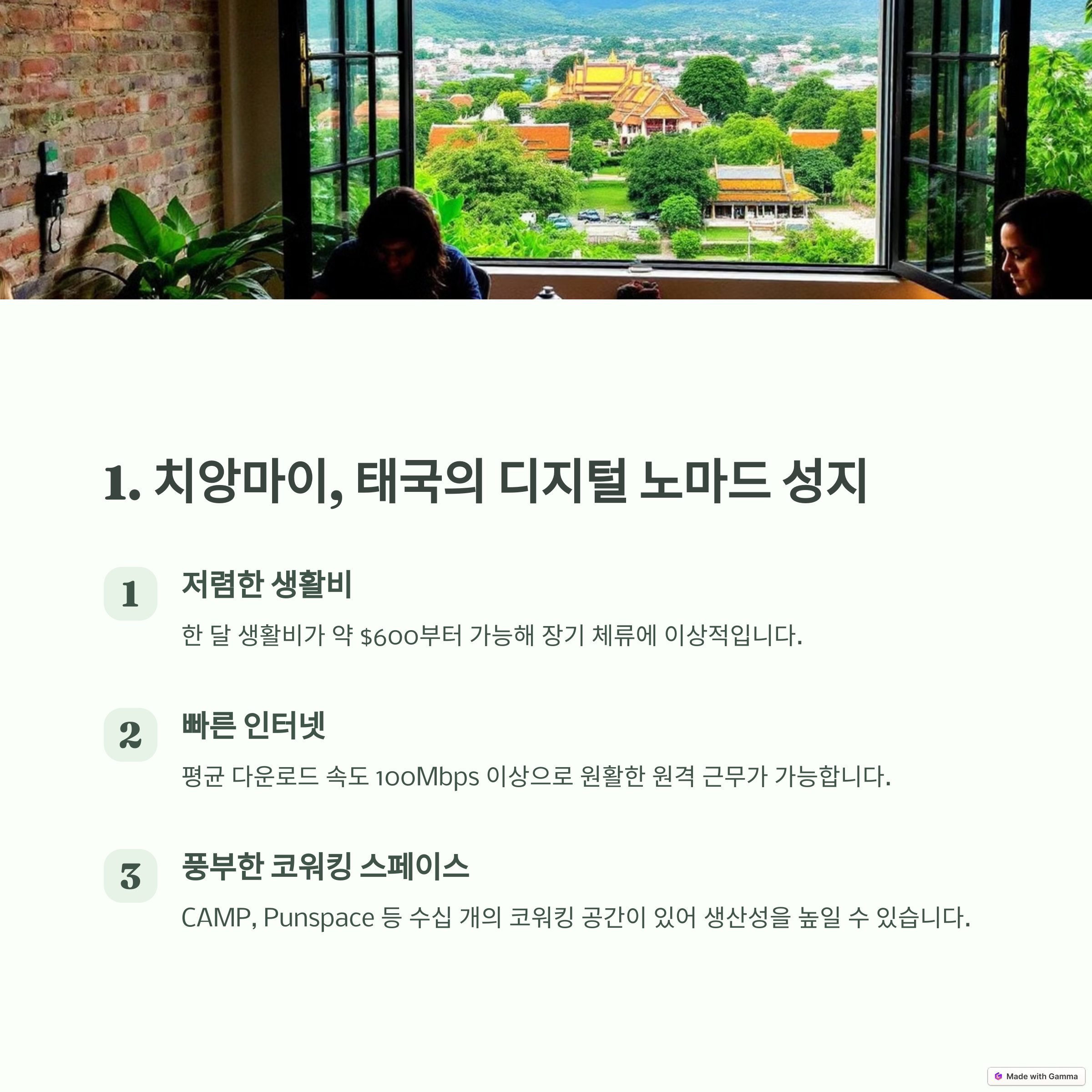 치앙마이는 디지털 노마드들에게 가장 사랑받는 도시 중 하나입니다. 저렴한 생활비, 맛있는 태국 음식, 그리고 활발한 노마드 커뮤니티 덕분에 많은 원격 근무자들이 이곳을 선택합니다. 도시 곳곳에 널려 있는 카페와 코워킹 스페이스에서 편안하게 일할 수 있고, 아름다운 자연과 사원이 있어 여유로운 삶을 즐길 수 있죠.