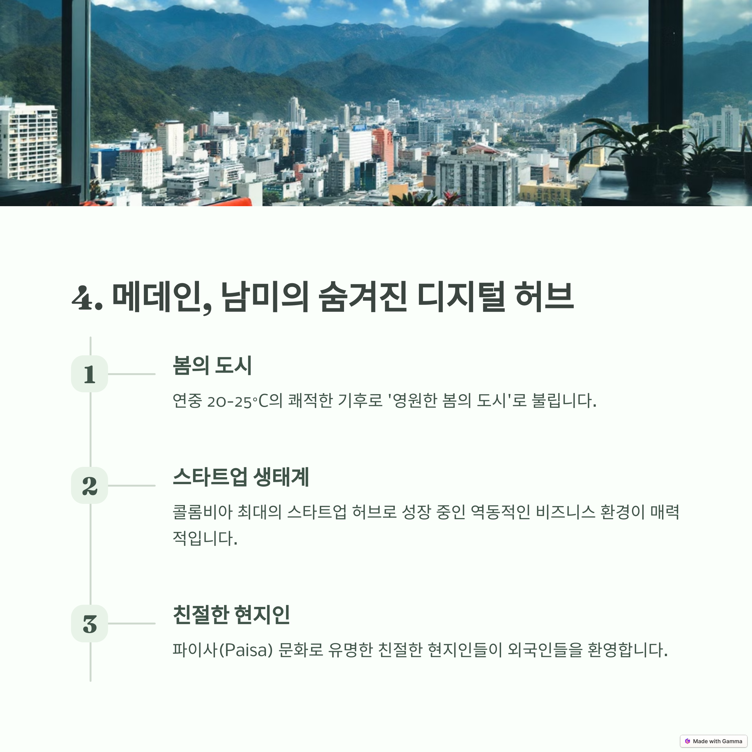 메데인은 ‘영원의 봄의 도시’라고 불릴 정도로 쾌적한 기후를 자랑합니다. 최근 몇 년 사이 디지털 노마드들에게 인기가 급상승하며, 활발한 스타트업 및 원격 근무 커뮤니티가 형성되었죠. 빠른 인터넷과 낮은 생활비, 현대적인 인프라가 매력적인 요소입니다.
